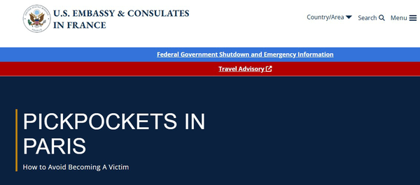 سفارت ایالاتمتحده در پاریس ، در توصیه به اتباع خود در فرانسه نوشت: «اولین قانون این است که چیزی بیشتر از آنچه حاضر به از دست دادنش هستید، در کیف پولتان نگذارید.» طبق این توصیه، پیشفرض در خیابانهای فرانسه این است که جیب شما حتما دزدیده میشود.