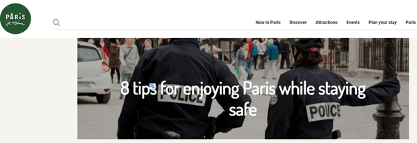 وبسایت توریستی «پاریس دوستت دارم» در گزارشی، 8 توصیه به گردشگران کرده است. این 8 توصیه عبارتاند از: 1. مراقب جیببرها باشید2. پرداختها را با کارتبانکی انجام دهید و پول نقد با خود حمل نکنید3. مراقب افرادی که به سمتتان میآیند، باشید4. چمدانها را نزدیک خود نگهدارید5. یک کپی از مدارک شناسایی نگهدارید6. پس از سرقت، با مقامات مربوطه تماس بگیرید7.اگر به شما حمله شد، با اورژانس تماس بگیرید8. شکایت خود را به زبانهای مختلف ثبت کنید
