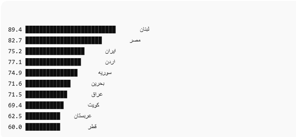 طبق داده‌های IQAir (کیفیت واقعی هوا و ذرات معلق PM2.5) و Numbeo (شاخص کلی آلودگی و کیفیت زندگی) در سال ۲۰۲۵، کشورهای عربی هم مانند ایران با مشکلات جدی آلودگی هوا روبه‌رو هستند.در میان کشورهای عربی، لبنان با میزان ذرات معلق برابر ۸۹.۴ میکروگرم بر مترمکعب در صدر قرار دارد و مصر با ۸۲.۷ میکروگرم، اردن با ۷۷.۱، سوریه با ۷۴.۹، بحرین با ۷۱.۶، عراق با ۷۱.۵ و عربستان سعودی با ۶۲.۵ میکروگرم در رده‌های بعدی هستند.کویت با حدود ۶۹.۴ و قطر با ۶۰ میکروگرم نیز وضعیت قابل توجهی دارند. ایران نیز با ۷۵.۲ میکروگرم PM2.5 یا همان ذرات معلق در میان کشورهای عربی و منطقه وضعیت نسبتاً بالایی از آلودگی دارد. لازم به ذکر است که شاخص آلودگی ارائه‌شده توسط پایگاه داده جهانی Numbeo تنها به غلظت ذرات معلق بسیار ریز محدود نمی‌شود و عواملی مانند کیفیت آب، مدیریت زباله، آلودگی صوتی و دسترسی به فضای سبز را نیز شامل می‌شود؛ به همین دلیل، لبنان در این شاخص بالاتر از دیگر کشورها قرار دارد، حتی اگر در برخی مناطق عراق یا ایران میزان ذرات معلق بیشتر باشد.