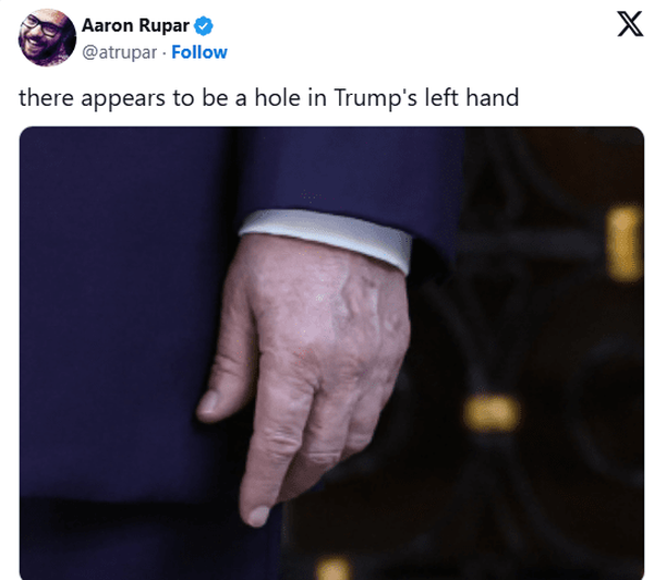 کاربران در شبکه اجتماعی ایکس عکس‌هایی از ترامپ ۷۹ ساله منتشر کردند و مدعی شدند که در دست او «سوراخ» هایی ایجاد شده است.خبرنگار آرون روپار در ایکس تصاویری از ترامپ در حال دیدار بااوکراین، ولودیمیر زلنسکی،منتشر کرد و نوشت: «به نظر می‌رسد در دست چپ ترامپ یک سوراخ وجود دارد.دست‌های او امروز خیلی تغییر رنگ پیدا کرده اند.» روپار در پست دیگری اشاره کرد که دست راست ترامپ هم پیش‌تر دچار تغییر رنگ شده بود و اکنون دست چپ او هم این وضعیت را دارد.