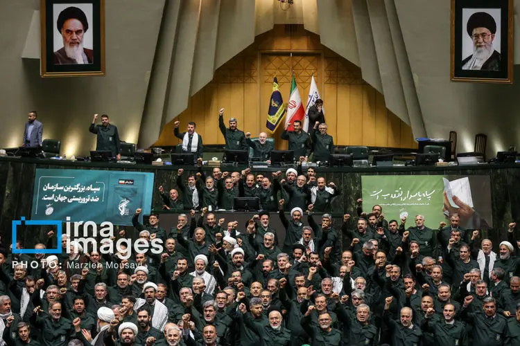 رئیس و نمایندگان مجلس در محکومیت اقدام اروپاییها علیه سپاه پاسداران لباس سپاه را بر تن کردند و شعار "مرگ بر آمریکا" و "مرگ بر اسرائیل" سر دادند.