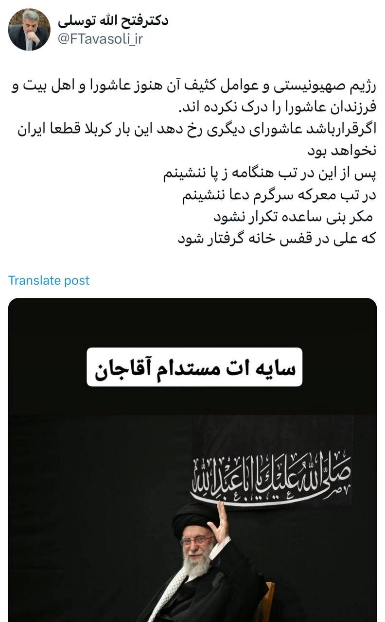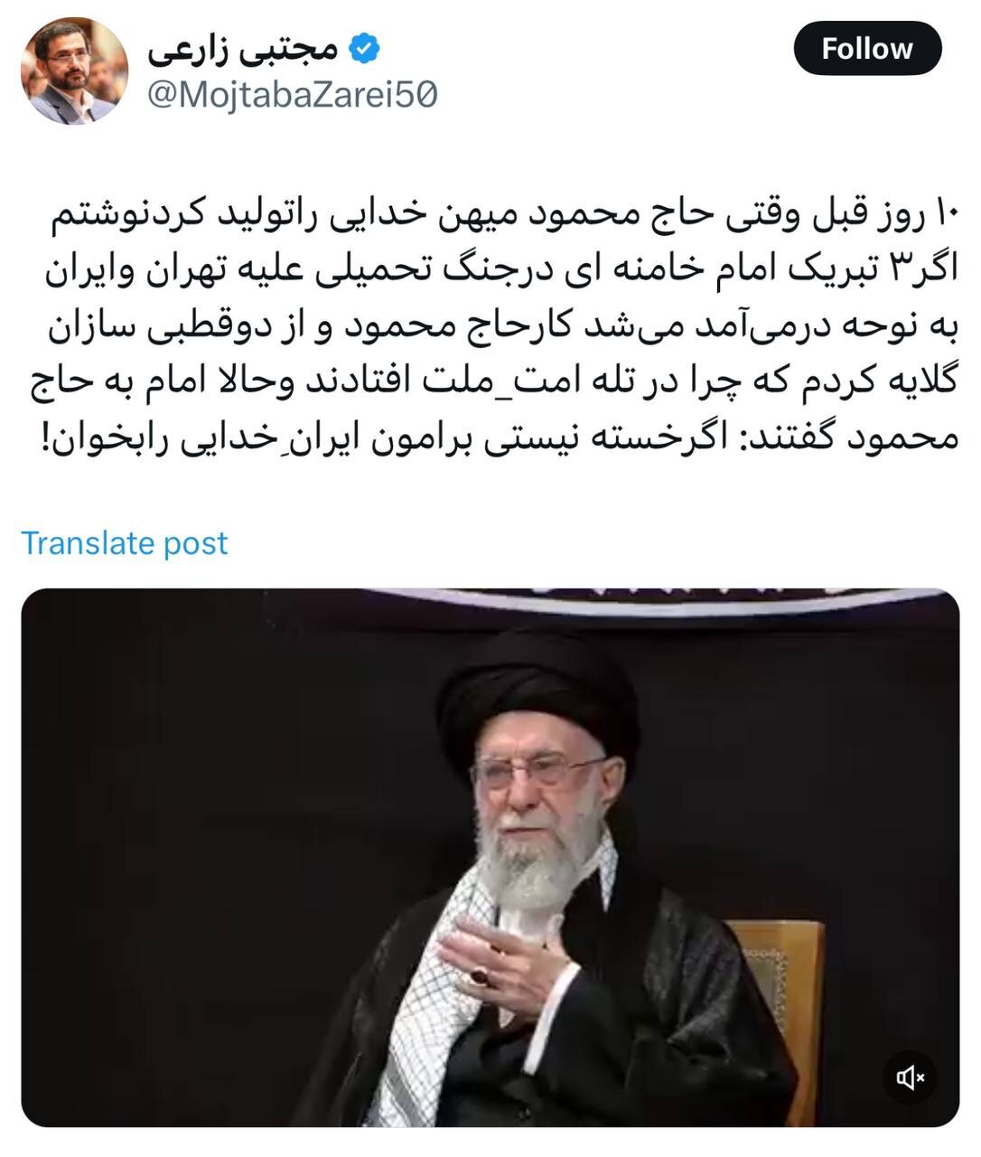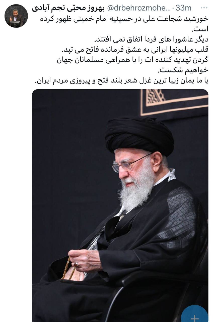 شناسه خبر: ۱۳۲۳۰۸۹ ۱۴۰۴/۰۴/۱۵ - ۱۳:۰۰ خانه | سیاسی از عکس خاصی که قالیباف منتشر کرد تا واکنش به نوحه حاج محمود کریمی و... سلام فرمانده نمایندگان مجلس شورای اسلامی به حضور رهبر معظم انقلاب در مراسم شب عاشورای حسینی در حسینیه امام خمینی (ره) واکنش نشان دادند. برخی از این واکنش ها را در ادامه می بینید. کد خبر لینک کوتاه کپی شد ۰ A واکنش عراقچی به حضور رهبر انقلاب در حسینیه امام خمینی واکنش رسانه صهیونی به حضور رهبر انقلاب در مراسم عزاداری کلمات کلیدی: امام خمینی رهبر معظم انقلاب مجلس شورای اسلامی واکنش عکس
