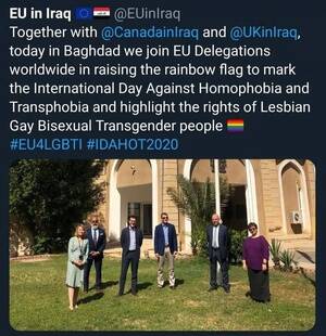 روز ۲۸ اردیبهشت ۱۳۹۹ مراسمی در نمایندگی اتحادیه اروپا در عراق برای حمایت از همجنسبازی با حضور سفیر کانادا و انگلیس برگزار و پرچم هفت رنگ «همجنسبازان» در محوطه ساختمان این مرکز برافراشته شد.