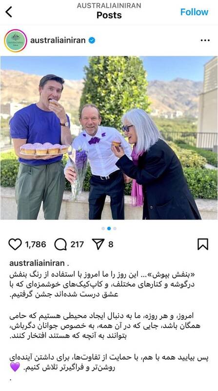 «ایان مک کانویل» سفیر استرالیا در تهران به همراه دبیر دوم سفارت این کشور در ایران پستی در صفحه اینستاگرامی سفارت استرالیا در حمایت از همجنس بازان منتشر کردند. در این پست آمده است: «بنفش بپوش؛ این روز را ما امروز با استفاده از رنگ بنفش در گوشه و کنارهای مختلف و کاپ کیکهای خوشمزهای که با عشق درست شدهاند، جشن گرفتیم».