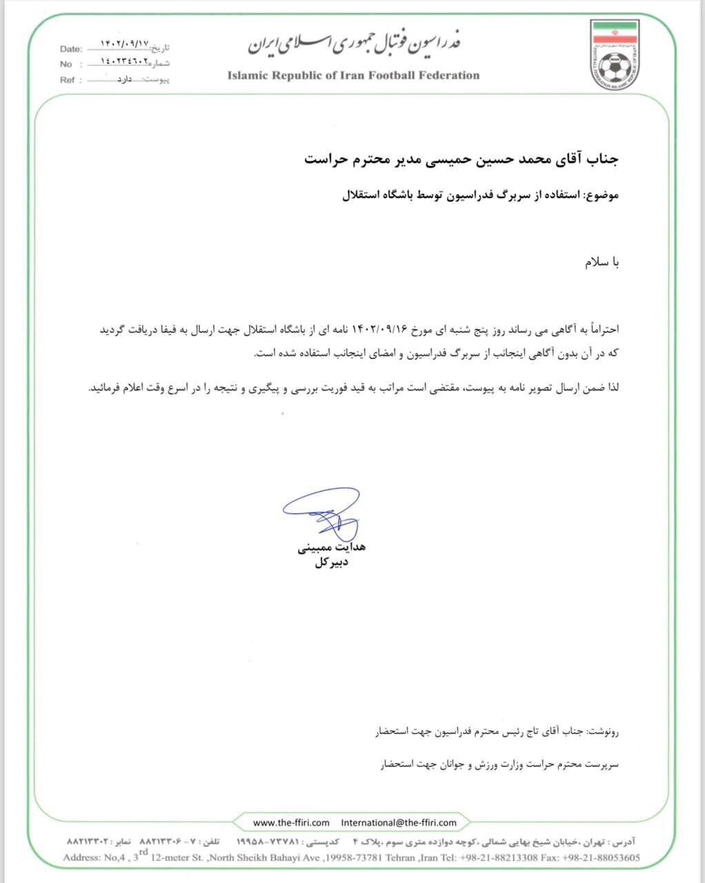 تصویر نامه هدایت ممبینی دبیرکل فدراسیون فوتبال به حراست فدراسیون فوتبال در فضای مجازی منتشر شد.